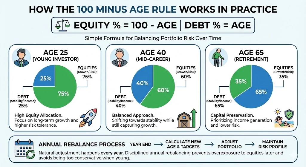 The rule follows the lifecycle investing model. During early working years, the focus is on wealth creation. During later years, the focus shifts to capital protection and income stability.