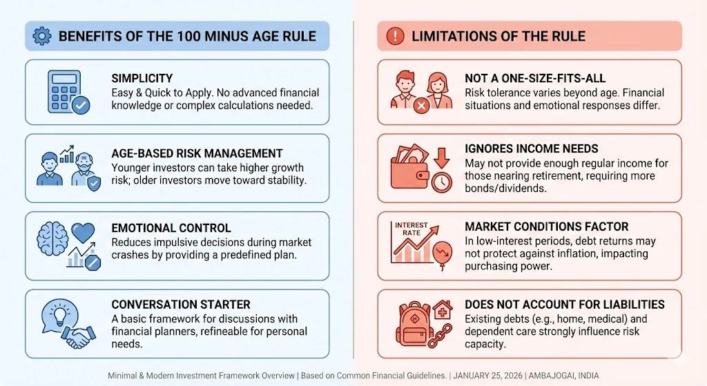 Others criticize it for ignoring personal factors. A healthy 60 year old with stable income may safely hold more equities than the rule allows. A young person with heavy debt may need lower risk exposure despite age.